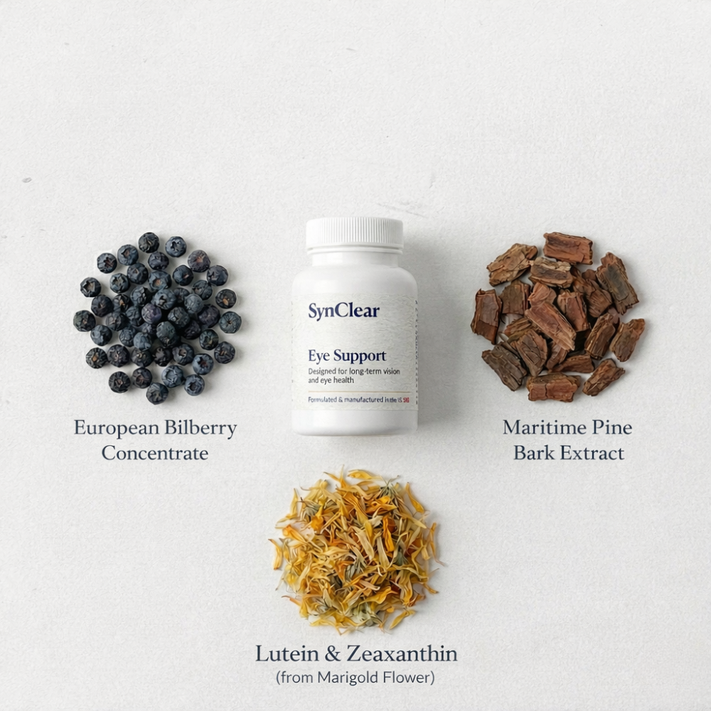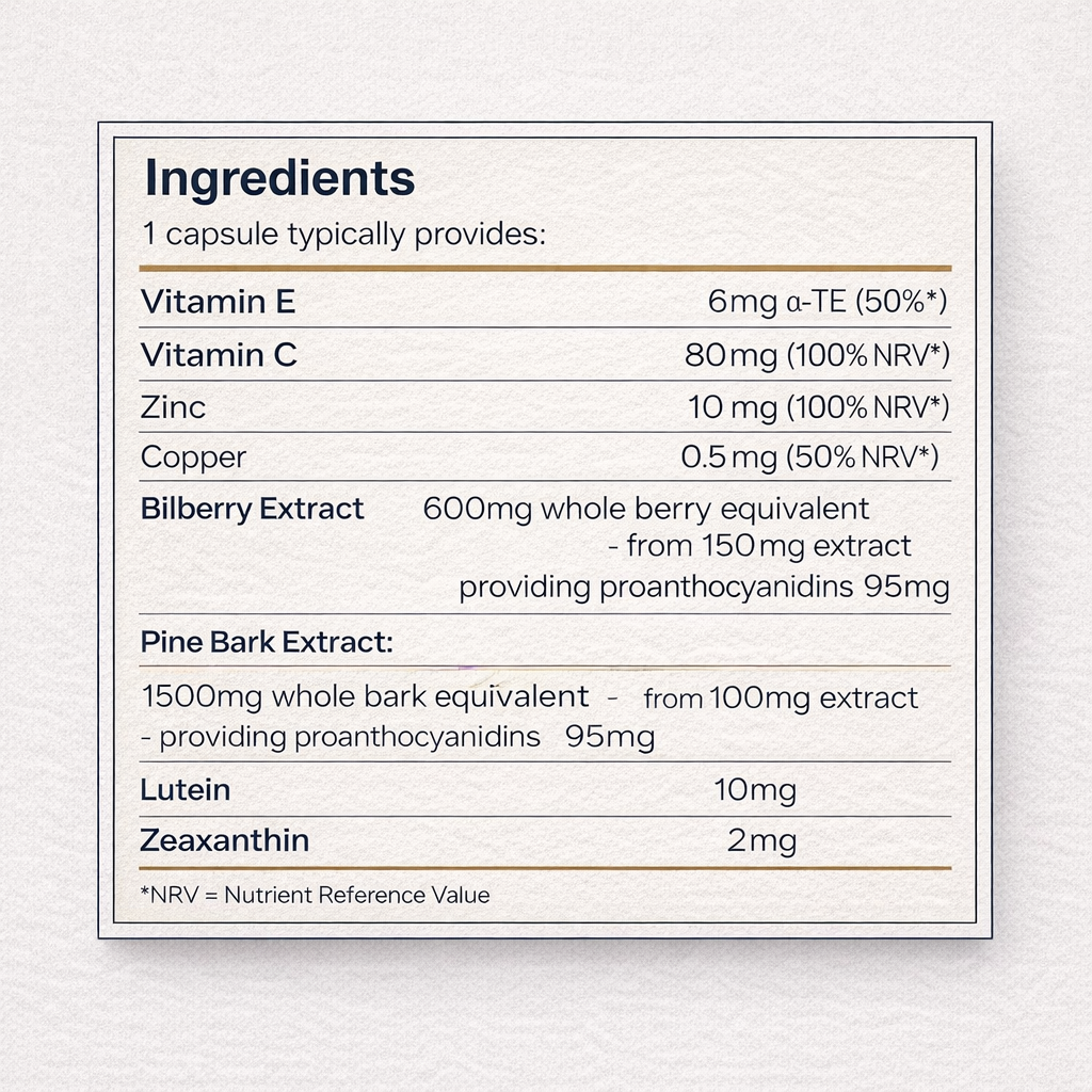Powered by Bilberry, Pine Bark, Lutein, and Zeaxanthin — alongside essential vitamins and minerals — it supports long-term eye health, visual clarity, and daily eye resilience.